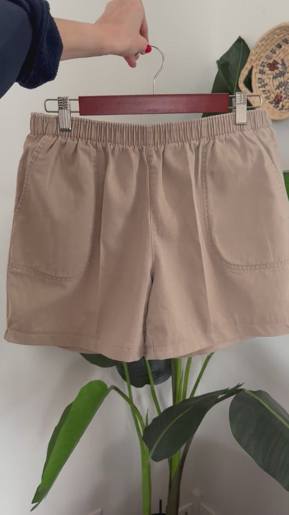 Preloved pants repurposed into casual summer shorts! Khaki-colored with front pockets and an elastic waistband for a comfortable fit.