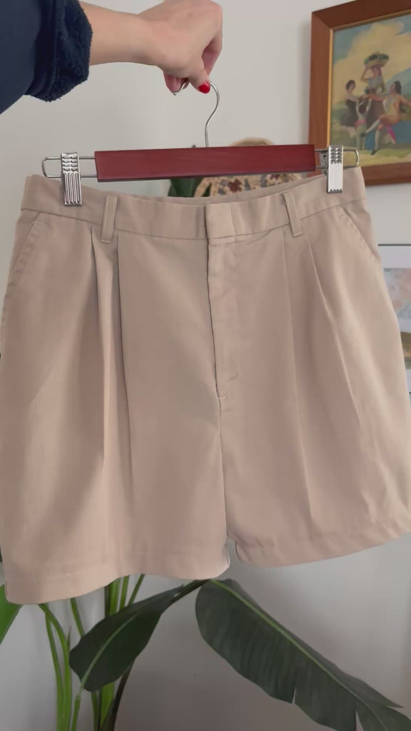Beige pleated shorts upcycled from vintage trousers. Functional flat pockets in front, flattering darts on backside.